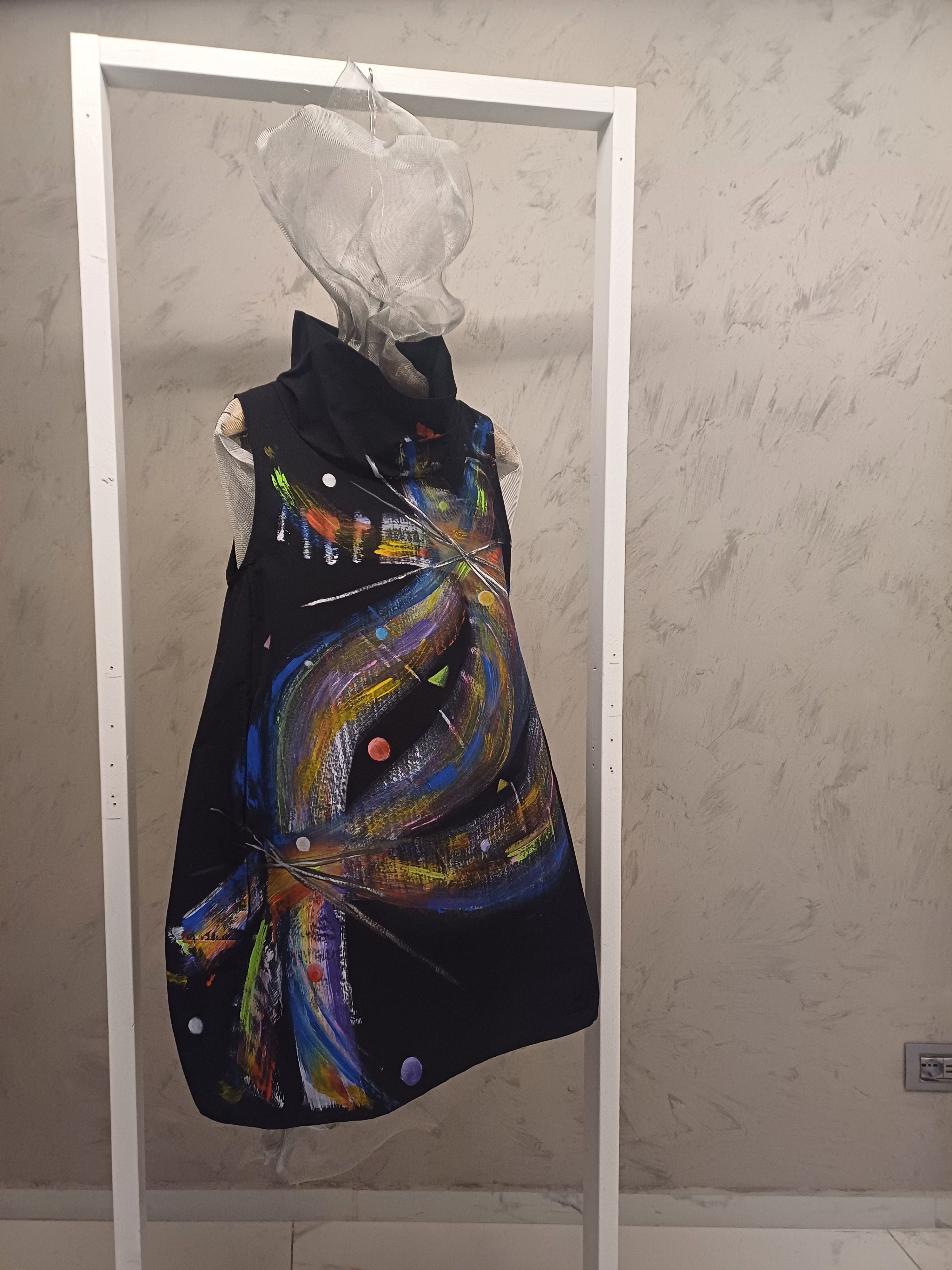 Taddi è arte. In questa mostra ce ne dà nuovamente prova presentandoci i suoi lavori su tessuti di splendidi abiti invece che su tele, confermandoci ancora una volta quanto il pensiero si faccia strada su spazi, forme e materiali pur di comunicare. (T.C.)